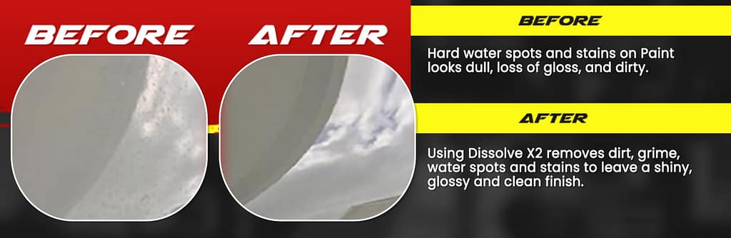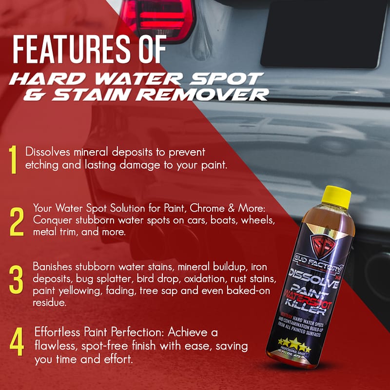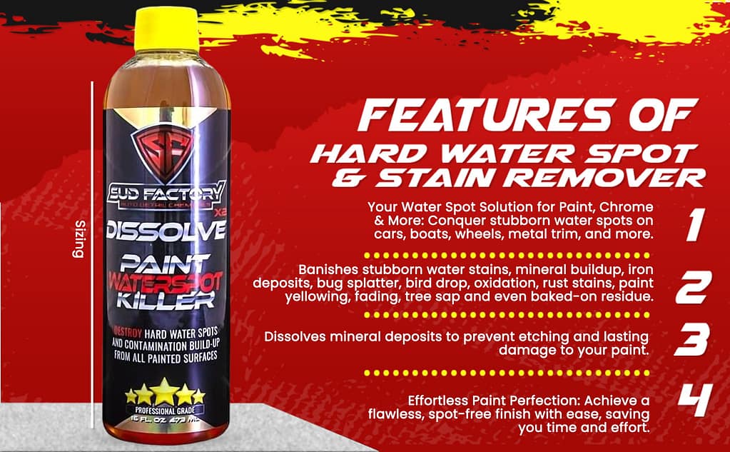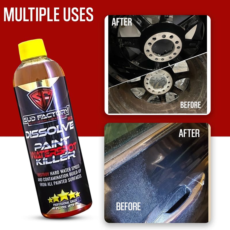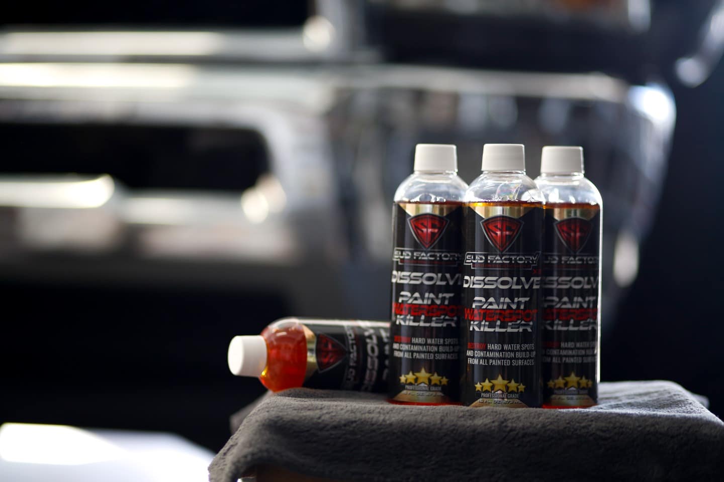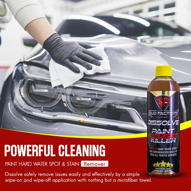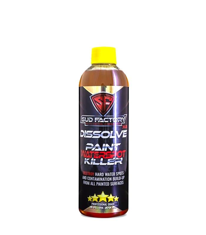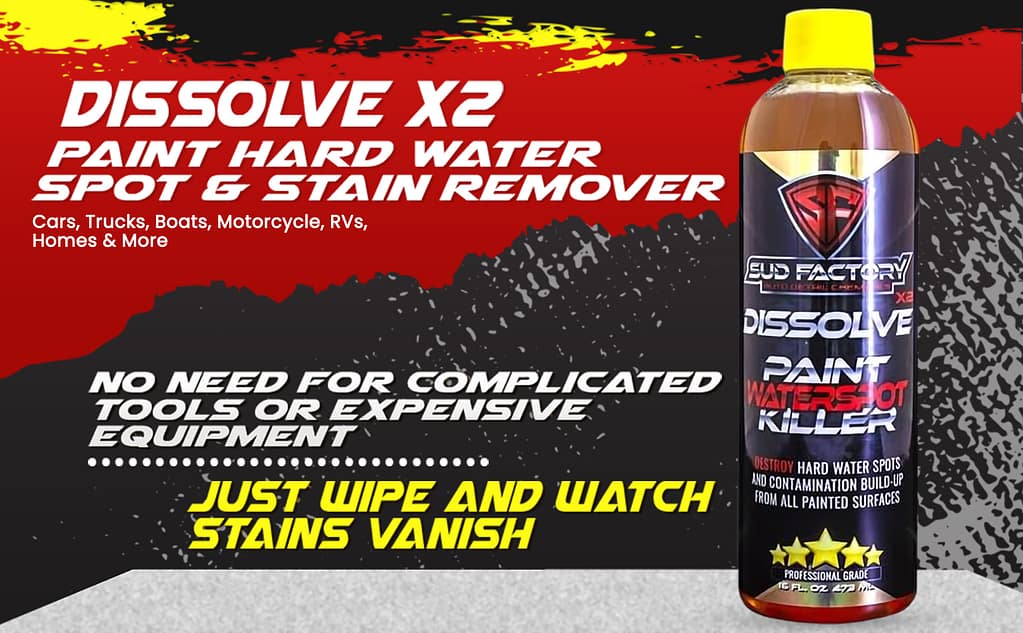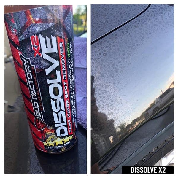 Sud Factory Premium Detail Products Dissolve X2 is the leader in water spot removal for paint, chrome, aluminum, mirrors, boats, and more. Dissolve is specialized in preventing paint and surface damages due to contamination that may ingrain into the surfaces causing permanent damages costing you hundreds to fix. It is developed to remove deep water spot stains and other build-ups before it’s too late. Removes permanently, not temporarily.