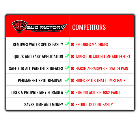 After trying 3 other products that did not remove the water spots on my ford truck I called a friend that used to detail cars . He told me another sud Factory. Your product worked so amazing. Two ounces did my entire truck . Amazing product.